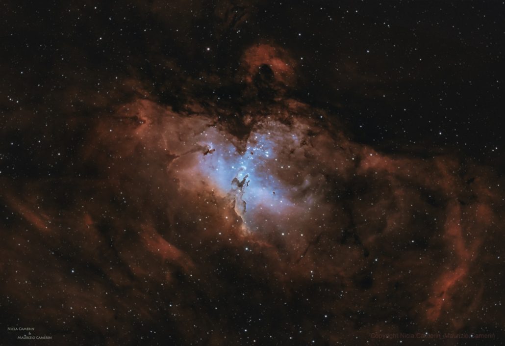 Si tratta dei Pilastri della Creazione gli stessi della foto più iconica del telescopio spaziale Hubble del 1995. Mostra tre “pilastri” di polvere e gas cosmici nel cuore della Nebulosa Aquila (nota anche come M16), una nuvola di gas interstellare e polvere a 7000 anni luce dalla Terra. 🔭