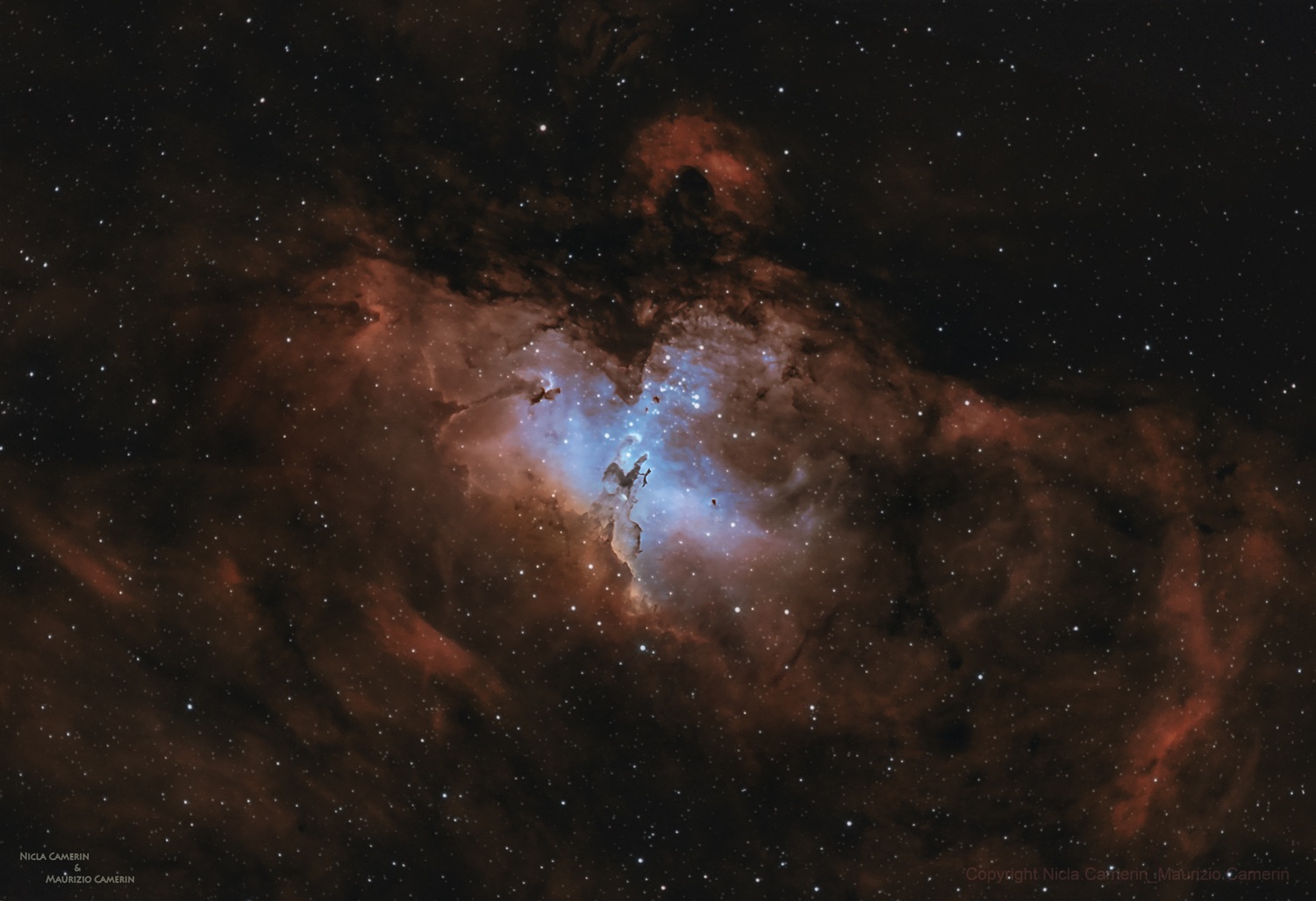 “La Nebulosa Aquila (M16) e il suo ammasso centrale NGC 6611 è una delle regioni di formazione stellare più spettacolari e conosciute nel cielo, principalmente grazie alle meravigliose immagini del Pilastro della Creazione del telescopio spaziale Hubble. NGC 6611 è un ammasso giovane (1-3 Myrs), relativamente vicino al nostro Sole (1.7k pc) e con una ricca popolazione stellare di stelle sia di piccola massa che di alta massa.