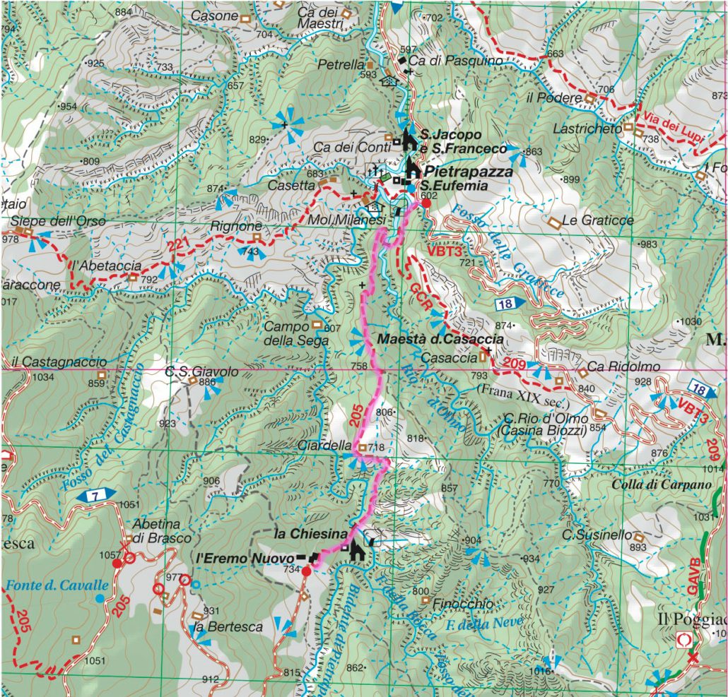 Lasciata Trappisa alle spalle, giungete a Pietrapazza in auto o a piedi. A questo punto nel piazzale sopra alla chiesa attraversate il pontino e prendete il sentiero 205. Seguendo quel sentiero giungerete prima ad una mestà posta sopra al crinale, molto caratteristica e panoramica.